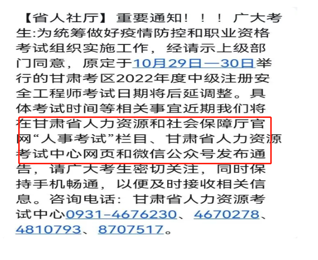 短信通知:【省人社厅】重要通知!!!广大考生:为统筹做好疫情防控和职业资格考试组织实施工作,经请示上级部门同意,原定于10月29日—30日举行的甘肃考区2022年度中级注册安全工程师考试日期将后延调整。具体考试时间等相关事宜近期我们将在甘肃省人力资源和社会保障厅官网“人事考试”栏目、甘肃省人力资源考试中心网页和微信公众号发布通告,请广大考生密切关注,同时保持手机畅通,以便及时接收相关信息。咨询电话:甘肃省人力资源考试中心0931-4676230、4670278、4810793、8707517。