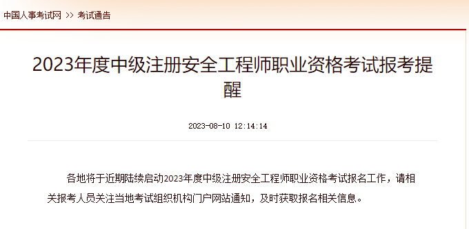 【摘要】【中国人事考试网】2023年度中级注册安全工程师职业资格考试报考提醒