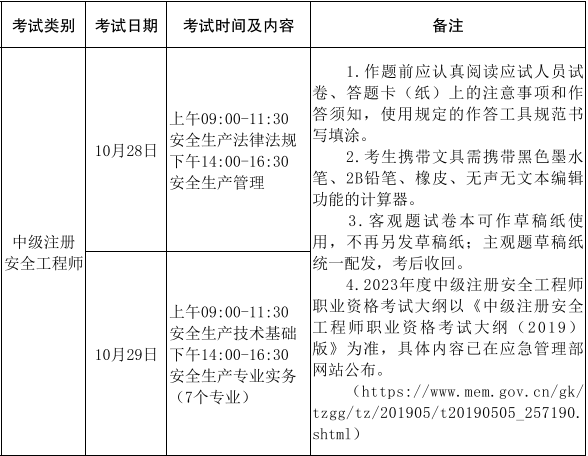 根据《人力资源社会保障部办公厅关于2023年度专业技术人员职业资格考试计划及有关事项的通知》(人社厅发〔2023 〕3号)和《人力资源社会保障部人事考试中心关于做好2023年度中级注册安全工程师职业资格考试考务工作的通知》(人考中心函〔2023〕47号)要求,为做好我省2023年度中级注册安全工程师职业资格考试考务工作,现将有关事项通知如下: