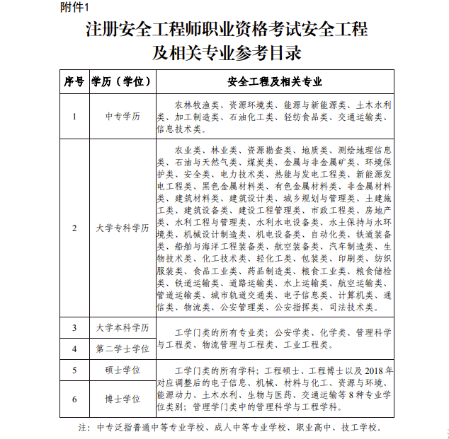 1.报名条件中“安全工程及相关专业”,按照《应急管理部办公厅关于印发〈注册安全工程师职业资格考试安全工程及相关专业参考目录〉的通知》(应急厅函〔2019〕410 号)执行,参考目录见附件 1。