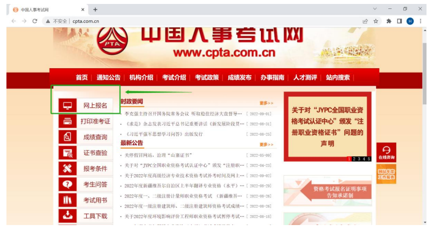 1、登录中国人事考试网:http://www.cpta.com.cn/ ,如下图,选择网上报名: