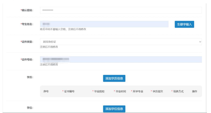 4、学历信息,请填写已经毕业的学历信息,在读的学历不要填写。【证书编号】是您的学历证书编号,如不记得,请通过学信网查询,不要填错。