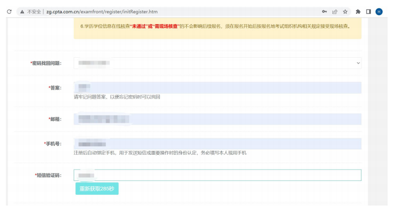 5、获取验证码后,会提示您再次输入以下信息,请认真填写