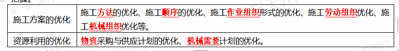 包含施工方案的优化和资源利用的优化两方面。其中施工方案优化内容可以通过记忆技巧“劳作方积蓄”把握。