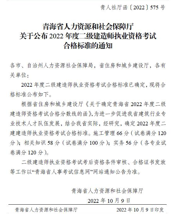 【合格标准】青海省人力资源和社会保障厅关于公布2022年度二级建造师执业资格考试合格标准的通知