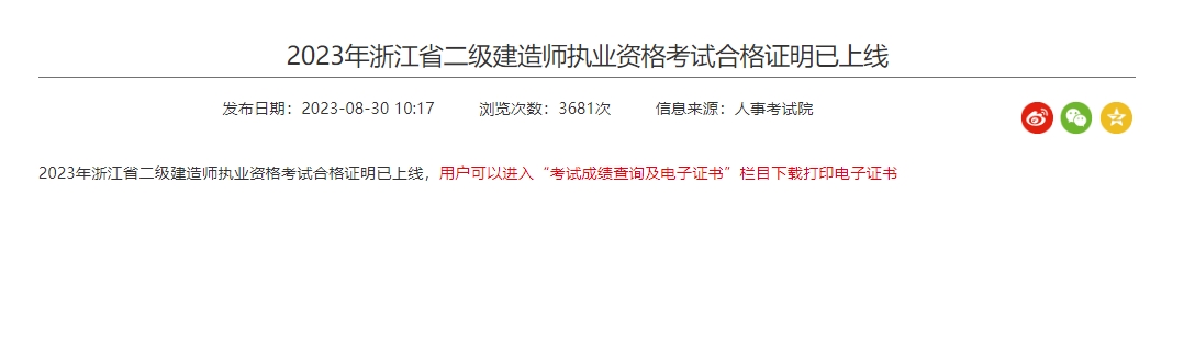 2023年浙江省二级建造师执业资格增项考试合格证明已上线,用户可以进入“考试成绩查 询及电子证书”栏目下载打印电子证书。