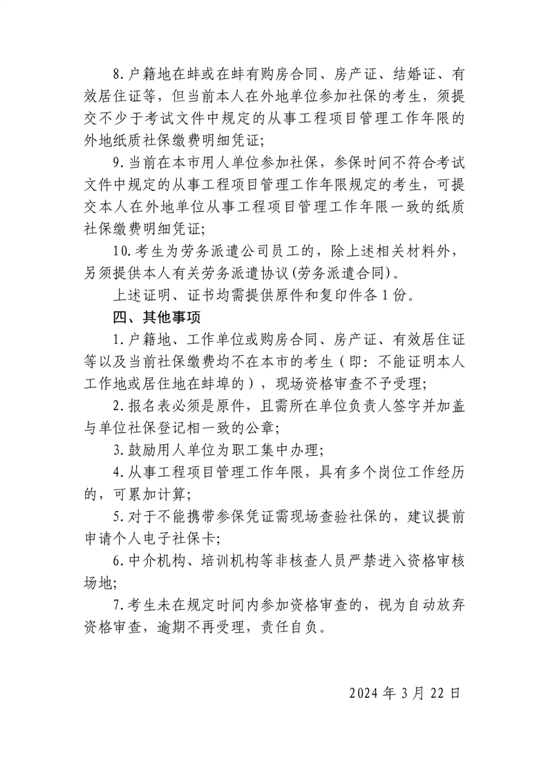 2024年安徽蚌埠二级建造师执业资格考试现场资审工作的提示