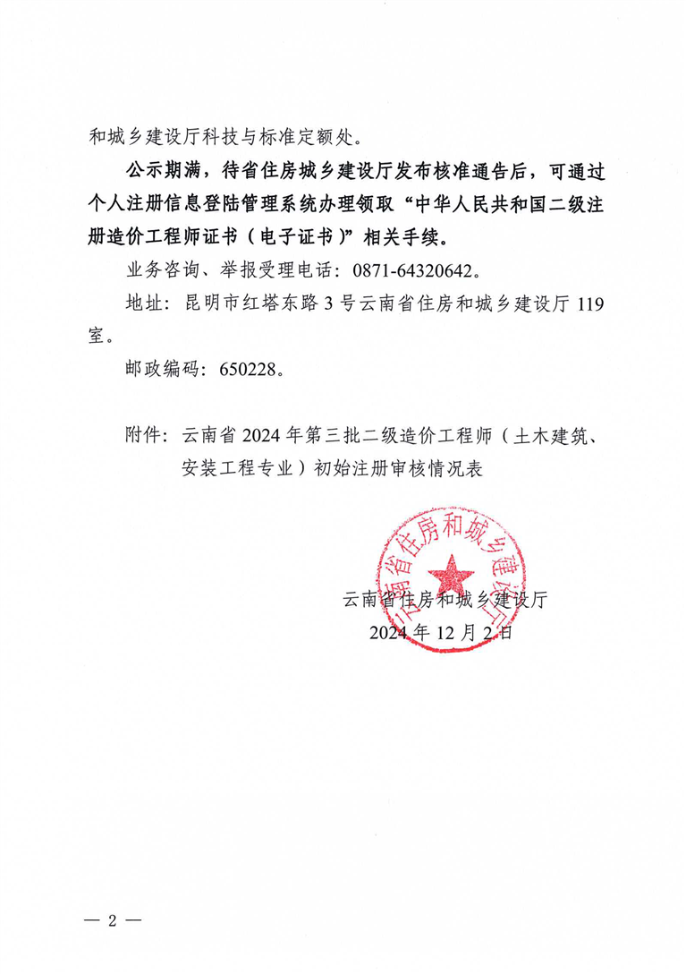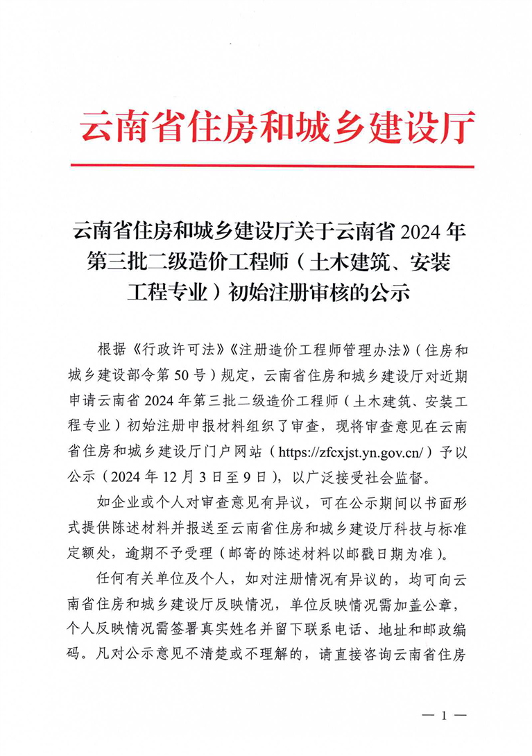 云南省住房和城乡建设厅关于云南省2024年第三批二级造价工程师(土木建筑、安装工程专业)初始注册审核的公示