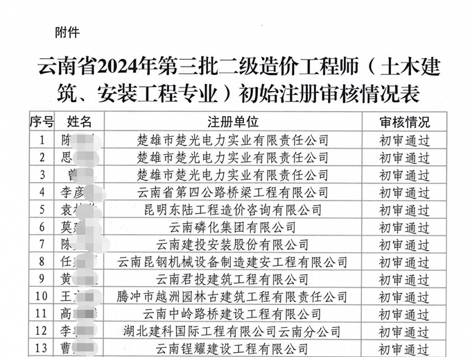 【摘要】云南省2024年第三批二级造价工程师(土木建筑、安装工程专业)初始注册审核的公示
