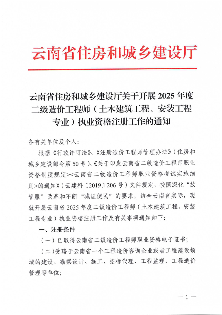 云南省住房和城乡建设厅关于开展2025年度二级造价工程师(土木建筑工程、安装工程专业)执业资格注册工作的通知
