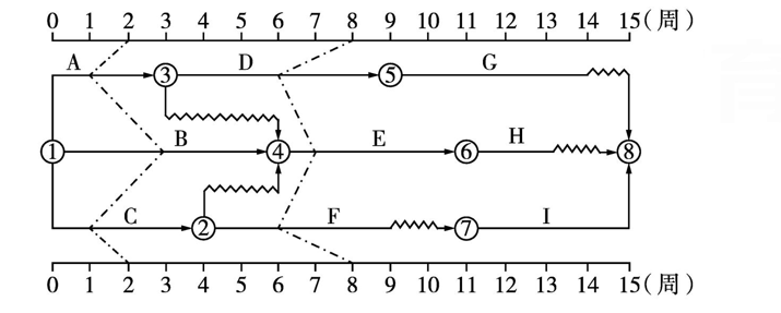 某工程时标网络计划执行到第 2 周及第 8 周末时,检查实际进度执行情况中前锋线所示,检查结果表明( )。