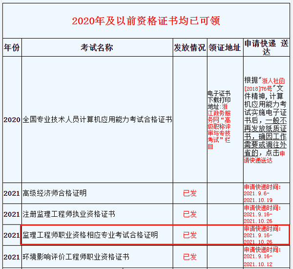 【摘要】2021年浙江监理工程师证书领取通知