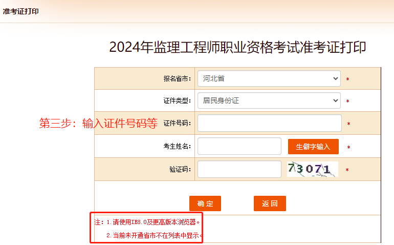 第三步:选择报名省市(一般只显示当前已开通的地区)和证件类型(一般为居民身份证); 填写证件号码、考生姓名和验证码,确认无误后点击确定即可显示个人准考证,考生可自行打印。