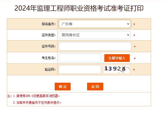 第三步:选择报名省市(一般只显示当前已开通的地区)和证件类型(一般为居民身份证); 填写证件号码、考生姓名和验证码,确认无误后点击确定即可显示个人准考证,考生可自行打印。
