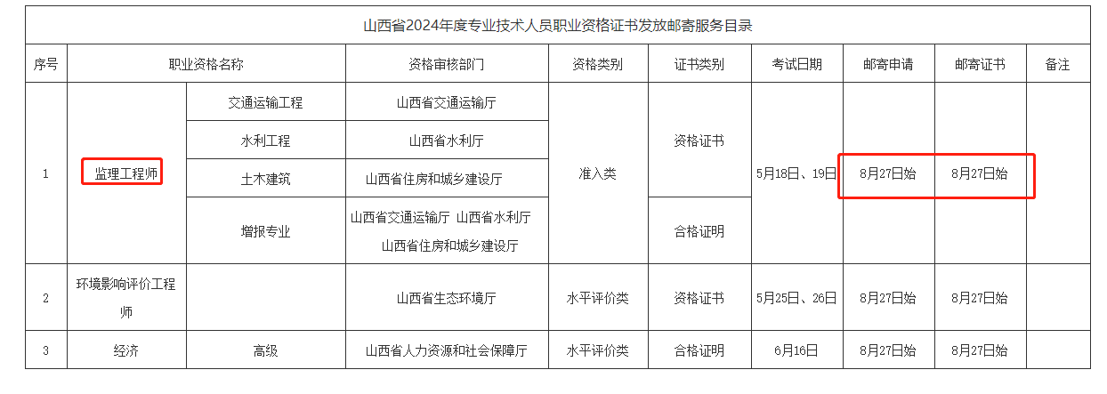 【邮寄目录】山西省2024年度专业技术人员职业资格证书发放邮寄服务目录