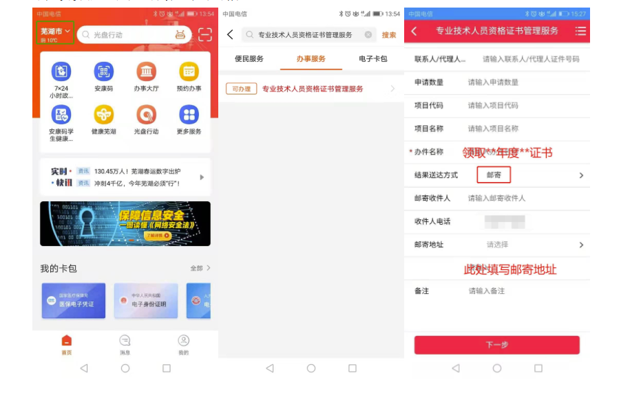 邮寄方式:方式1:移动端申请(推荐使用),手机下载皖事通APP,城市选择芜湖,搜索栏搜索“专业技术人员资格证书管理服务”,在线办理。
