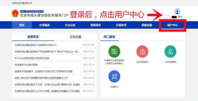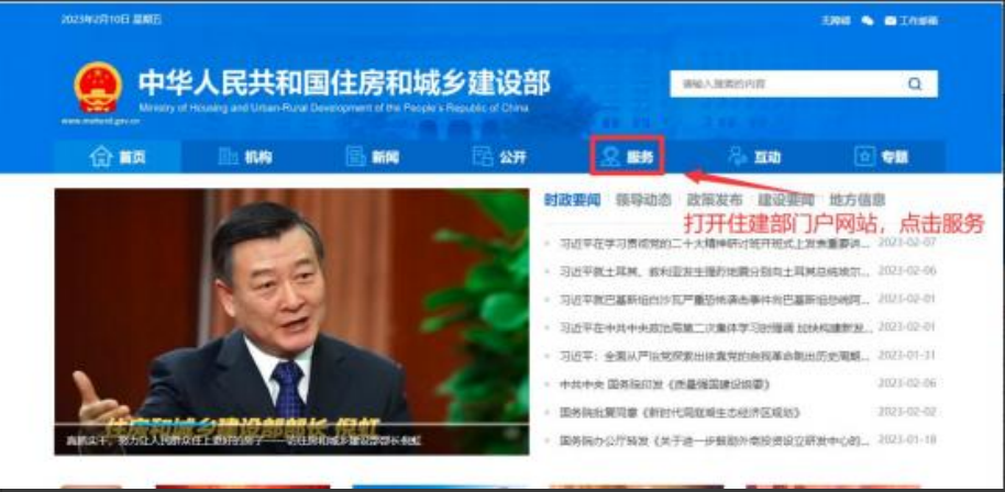 第一步:用户注册 1、打开住建部官方网(https://www.mohurd.gov.cn/),点击【服务】,进入住房和城乡建设部政务服务门户网站。