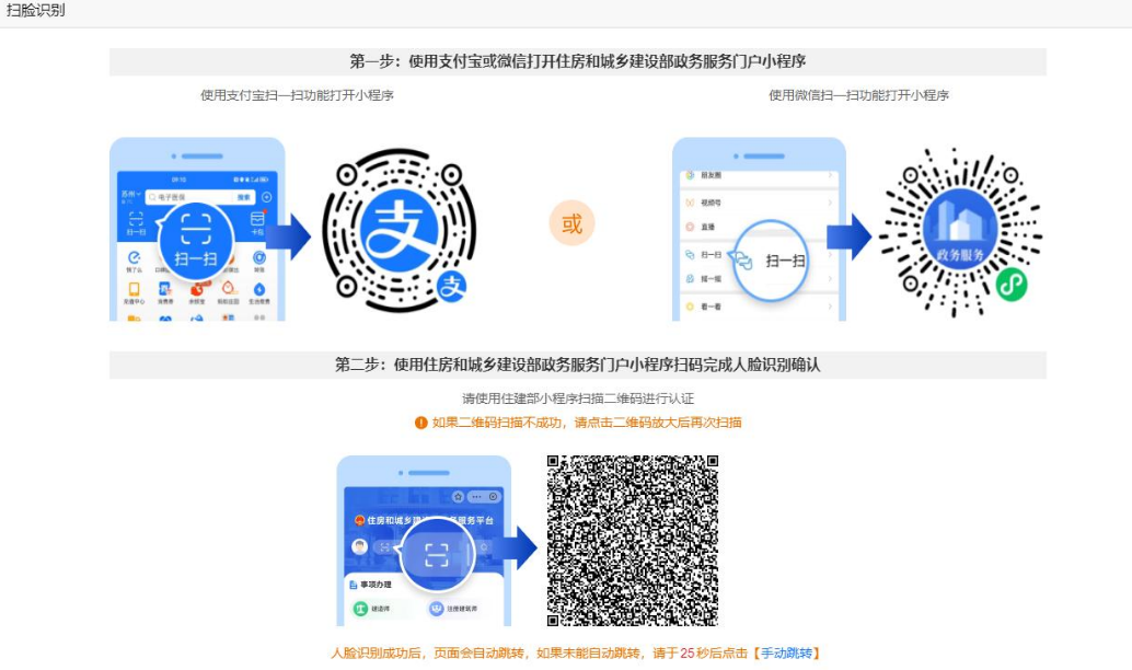 2、进入人脸识别页面,使用“支付宝”或者“微信”扫一扫识别小程序,然后使用小程序中的扫一扫识别二维码进行认证。