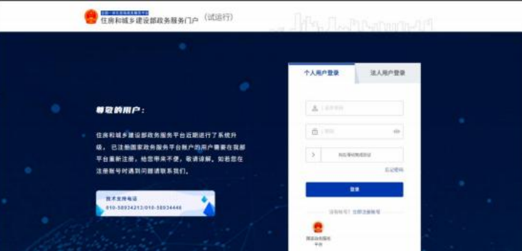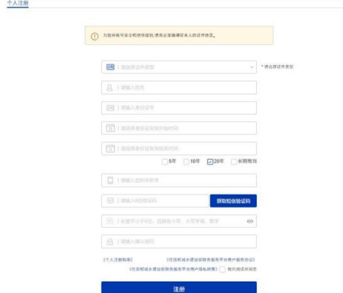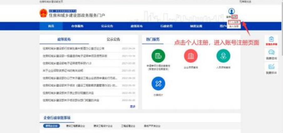2、进入住房和城乡建设部政务服务门户网站后,点击【注册】进入个人注册页面,按照提示完成个人账号注册。