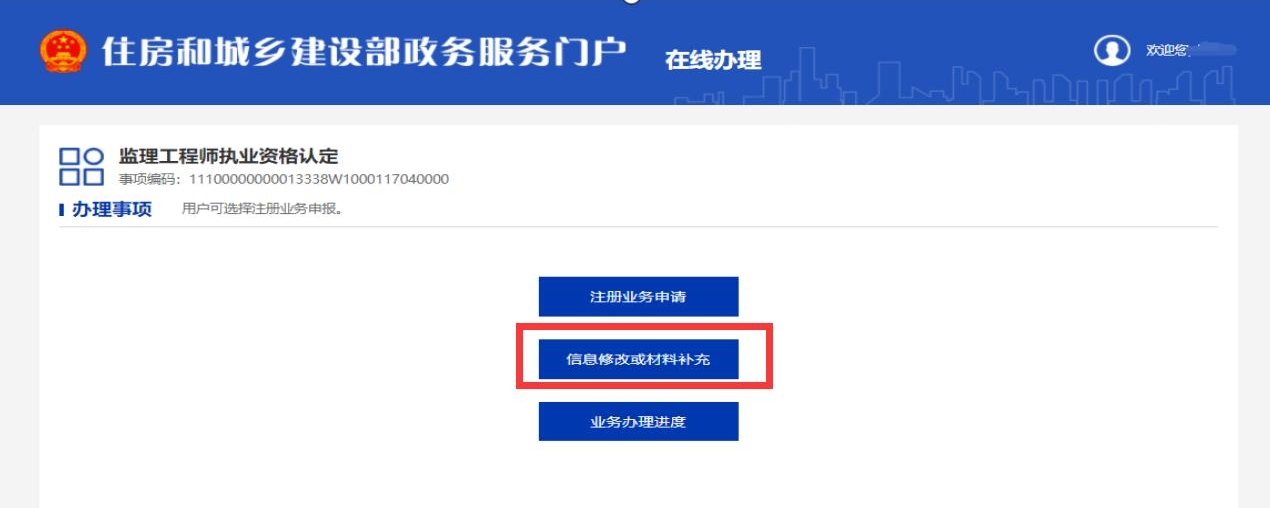 2、进入人员行政审批事项填报页面后,点击【信息修改或材料补充】。