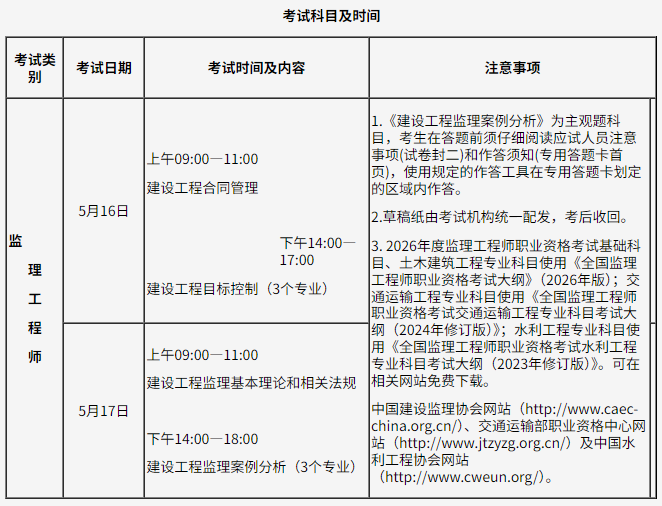 (人考中心函〔2026〕3号)要求,2026年度监理工程师职业资格考试于5月16日、17日举行。为做好我省考试考务工作,现将有关事项通知如下: