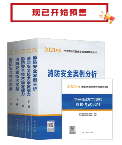 经上级批准,授权中国计划出版社独家出版发行《注册消防工程师资格考试辅导教材》(2021年版),内容包括《注册消防工程师资格考试大纲》(2021年版)、《消防安全技术实务》(上、下册)、《消防安全技术综合能力》(上、下册)及《消防安全案例分析》。