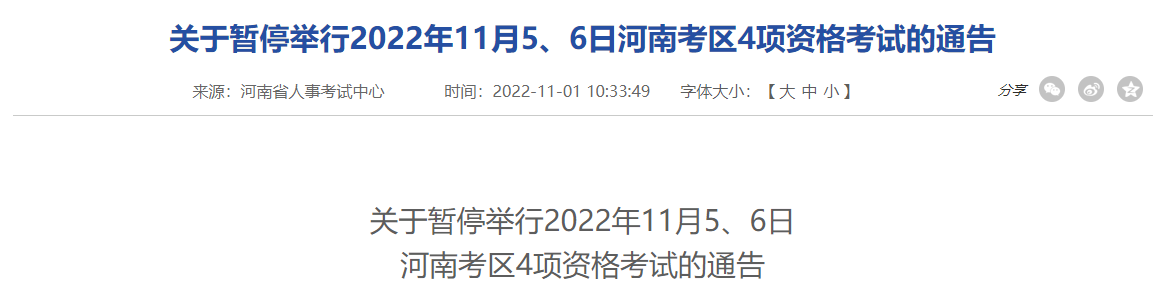 关于暂停举行2022年11月5、6日河南考区4项资格考试的通告