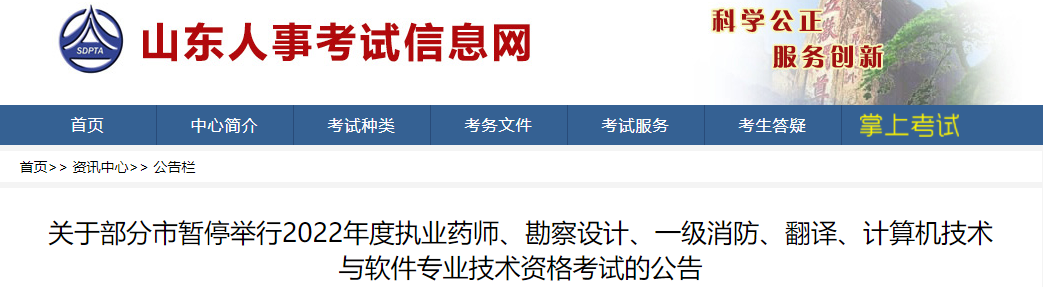鉴于新冠肺炎疫情防控最新形势,淄博、枣庄、东营、潍坊、济宁、泰安、德州、聊城、临沂等市根据当地疫情防控有关要求,暂停举行本考区2022年度执业药师、勘察设计、一级消防、翻译和计算机技术与软件专业技术资格考试,详情见市人事考试机构有关公告。公告网址如下: