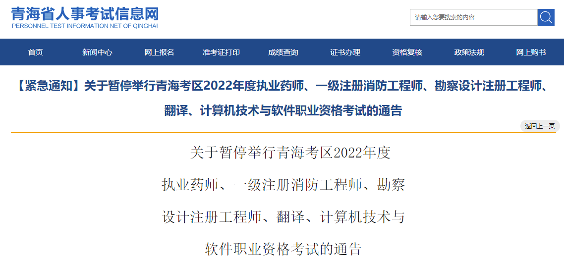 为全力做好疫情防控工作,切实保障广大考生和考务工作人员身体健康、生命安全,结合当前我省疫情防控最新形势,经综合研判,并请示省疫情联防联控领导小组疫情防控组同意,决定暂停原定于11月5—6日举行的青海考区2022年度执业药师、一级注册消防工程师、勘察设计注册工程师、下半年翻译专业资格(水平)、下半年计算机技术与软件专业技术资格(水平)五项资格考试。考试后续安排另行通知,请广大考生密切关注青海省人事考试信息网,及时了解相关信息。因暂停考试给您带来的不便,敬请谅解。