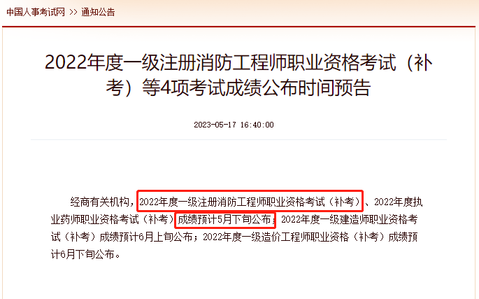 【中国人事考试网】2022年度一级注册消防工程师职业资格考试(补考)等4项考试成绩公布时间预告