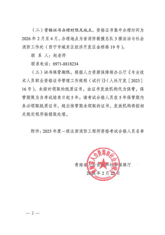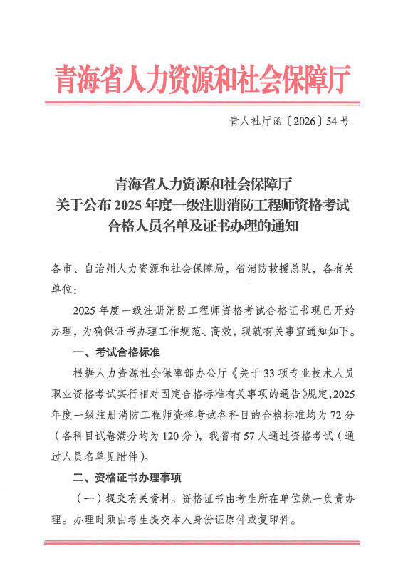 青海省人力资源和社会保障厅关于公布2025年度一级注册消防工程师资格考试合格人员名单及证书办理的通知