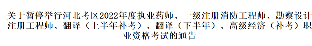 根据新冠肺炎疫情形势和疫情防控有关要求,决定暂停举行河北考区2022年度执业药师、一级注册消防工程师、勘察设计注册工程师、翻译(上半年补考:唐山和廊坊考区口译和笔译,秦皇岛、沧州和承德考区口译)、翻译(下半年)、高级经济(唐山和廊坊考区补考)职业资格考试。考试后续安排另行通知。给您带来的不便,敬请谅解。请广大报考人员密切关注河北省人事考试网、市级考试管理机构官方网站并保持手机畅通,以便及时了解相关信息。