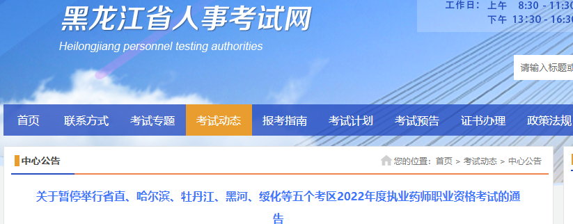 根据黑龙江省疫情防控形势,为落实属地疫情防控政策要求,充分保障广大应试人员身体健康和生命安全,经研究,决定暂停原定于11月5—6日举行的省直、哈尔滨、牡丹江、黑河、绥化等五个考区2022年度执业药师职业资格考试,其他考区考试正常进行。以上五个考区暂停考试的后续安排另行通知,请广大应试人员密切关注黑龙江省人事考试网(http://www.hljrsks.org.cn/)或电话咨询属地人事考试机构,联系电话可通过黑龙江省人事考试网主页“市地考试中心咨询方式”链接查询。