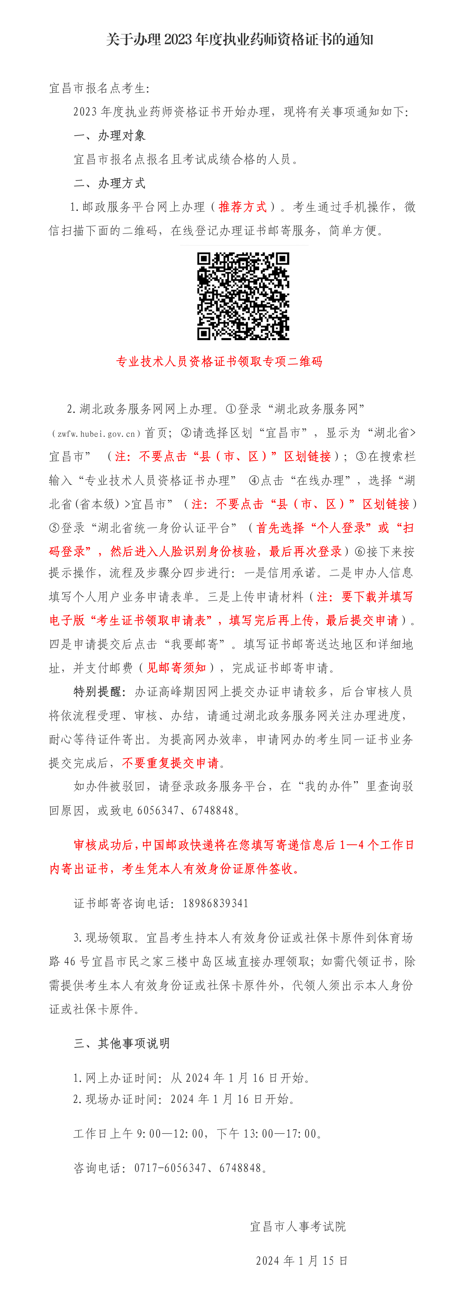 【证书】宜昌市关于办理2023年度执业药师资格证书的通知