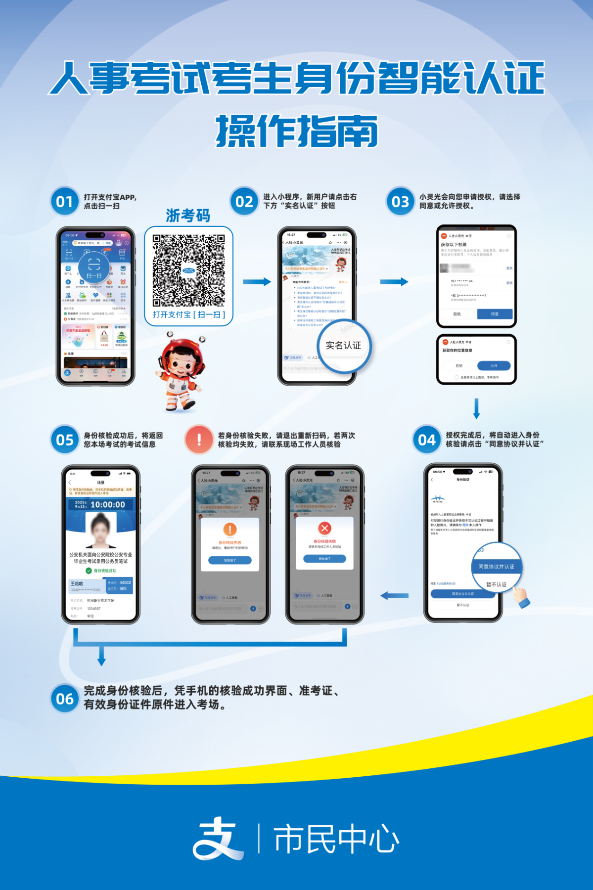 考试当天,请于每科目(场次)开考前1小时到达考点,在考点(考场)入口处使用支付宝扫一扫张贴的“浙考码”完成身份认证。