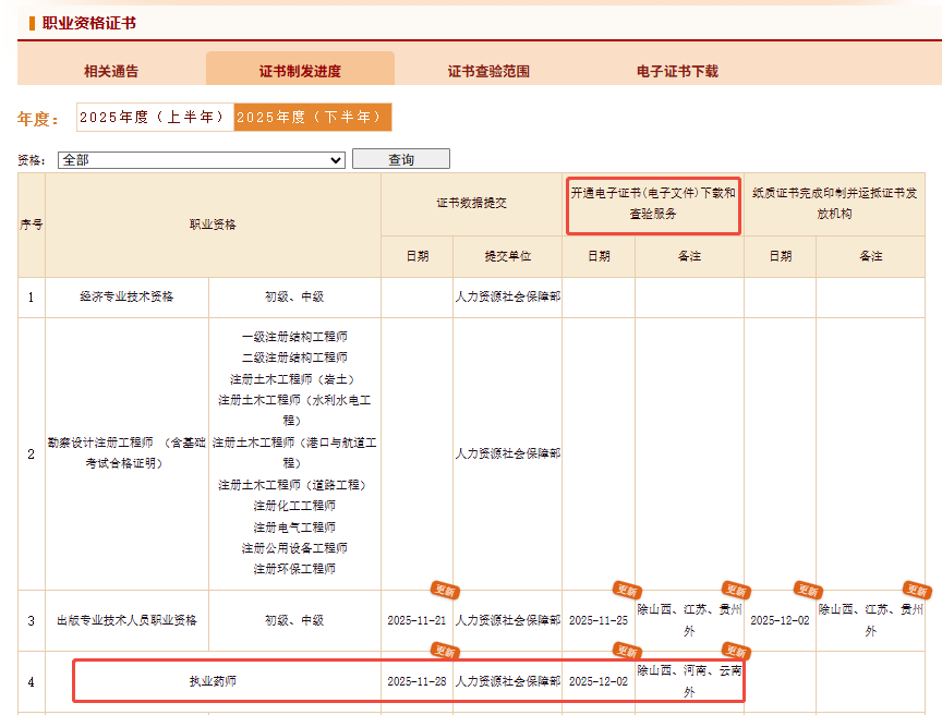 根据中国人事考试网最新通知,各地区2025年执业药师已开通电子证书下载和查验服务(除山西、河南、云南外),考生们可根据电子证书和证书电子文件下载(下载流程指南),及时下载和查验2025年执业药师电子合格证书。