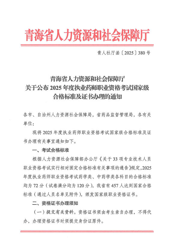 青海省人力资源和社会保障厅关于公布2025年度执业药师职业资格考试国家级合格标准及证书办理的通知