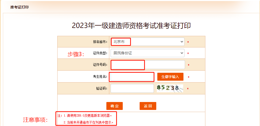 5)填写证件号码、考生姓名和验证码,确认无误后点击确定即可显示个人准考证,考生可自行打印。