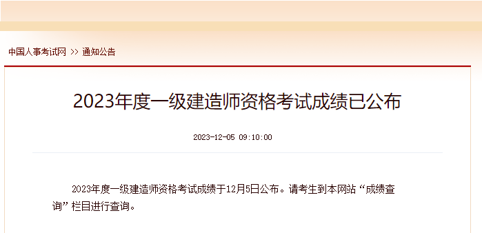 【中国人事考试网】2023年度一级建造师资格考试成绩已公布!