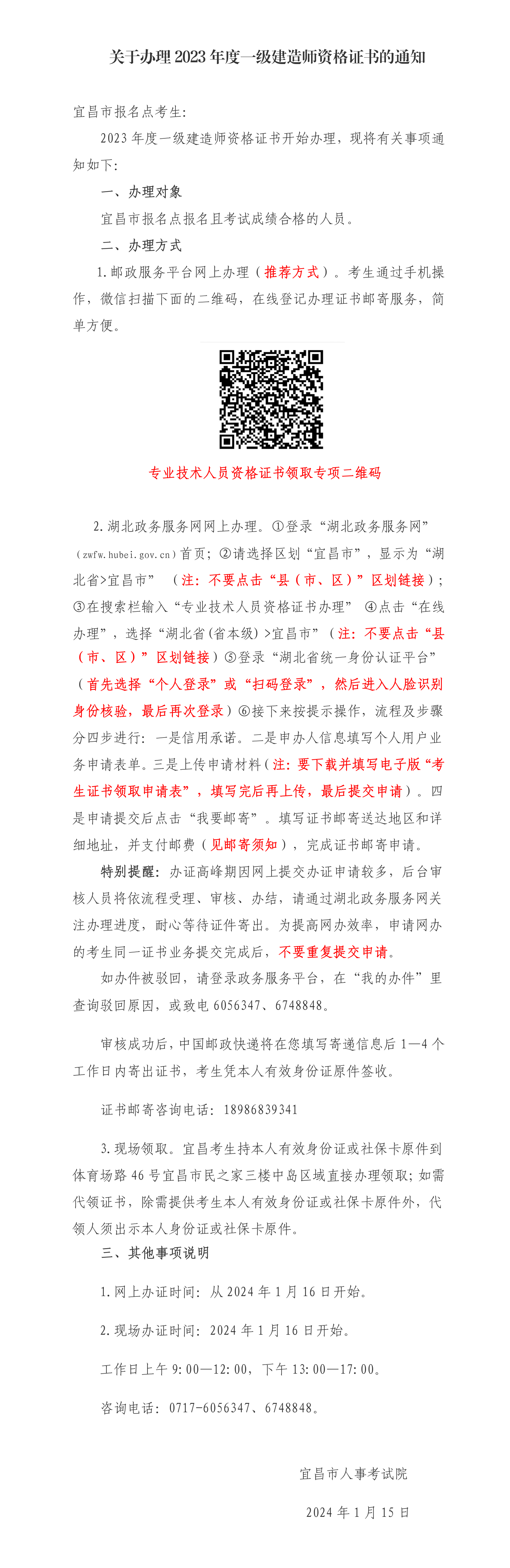【证书】宜昌市办理2023年度一级建造师资格证书的通知