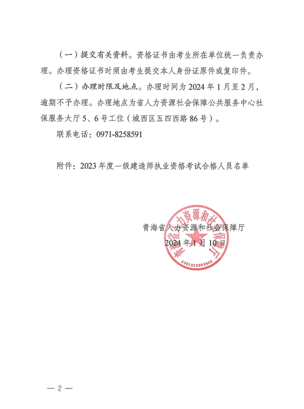 青海省人力资源和社会保障厅 关于公布2023年度一级建造师执业资格考试合格人员名单及证书办理的通知