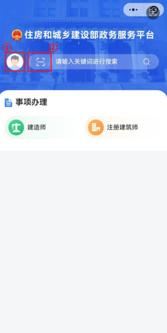 进入“用户中心”页面后,点击【我的证照】(图 6-①),然后打开手机“微信”APP,搜索并打开“住房和城乡建设部政务服务平台”微信小程序(图 7),首次使用时,请先设置“头像”和“昵称”并完成登录(图 8),完成登录后,点击“头像”(图 7-①),进入用户中心页面,点击“绑定门户账号”(图 9),按照提示输入“姓名”、“身份证号码”,点击“确认绑定”。绑定完成后,点击小程序中的扫一扫功能(图 7-②),扫描页面二维码(图 6-②),进入“人脸识别”页面(图 10),勾选授权项,点击“下一步”,按照提示进行人脸识别,识别无误提示“已通过”后,进入