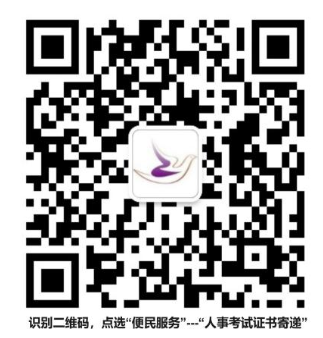 一、邮政EMS(免费,2-3天送达)。考生本人用微信搜索或扫码识别“政驿”公众号,点击下方“便民服务”菜单选择“人事考试证书邮寄”。邮政客服电话:周经理,17751970138。