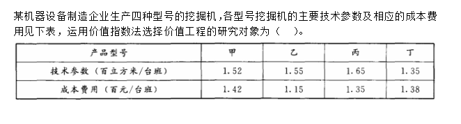 根据公式,V=F/C,则V甲=1.52/1.42≈1.07;V乙=1.55/1.15≈1.35;V丙=1.65/1.35≈1.22;V丁=1.35/1.38≈0.98。在应用价格指数法选择价值工程研究对象时,应当综合考虑价值指数偏离1的程度和改善幅度,优先选择V<1且改进幅度大的产品或零部件。故选择丁。
