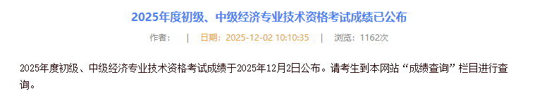 2025年度初级、中级经济专业技术资格考试成绩于2025年12月2日公布。请考生到黑龙江人事考试网“成绩查询”栏目进行查询。